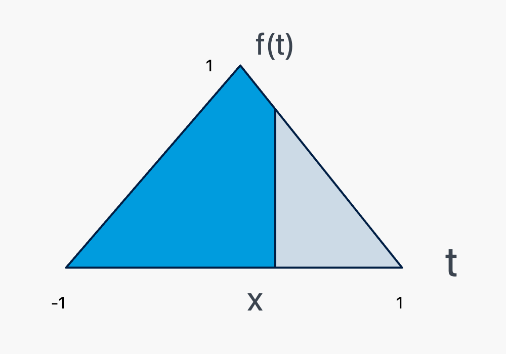 The cumulative distribution function is therefore a concave up parabola over the interval \(-1<x\le 0\) and a concave down parabola over the interval \(0<x<1\). Therefore, the graph of the cumulative distribution function looks something like this:
