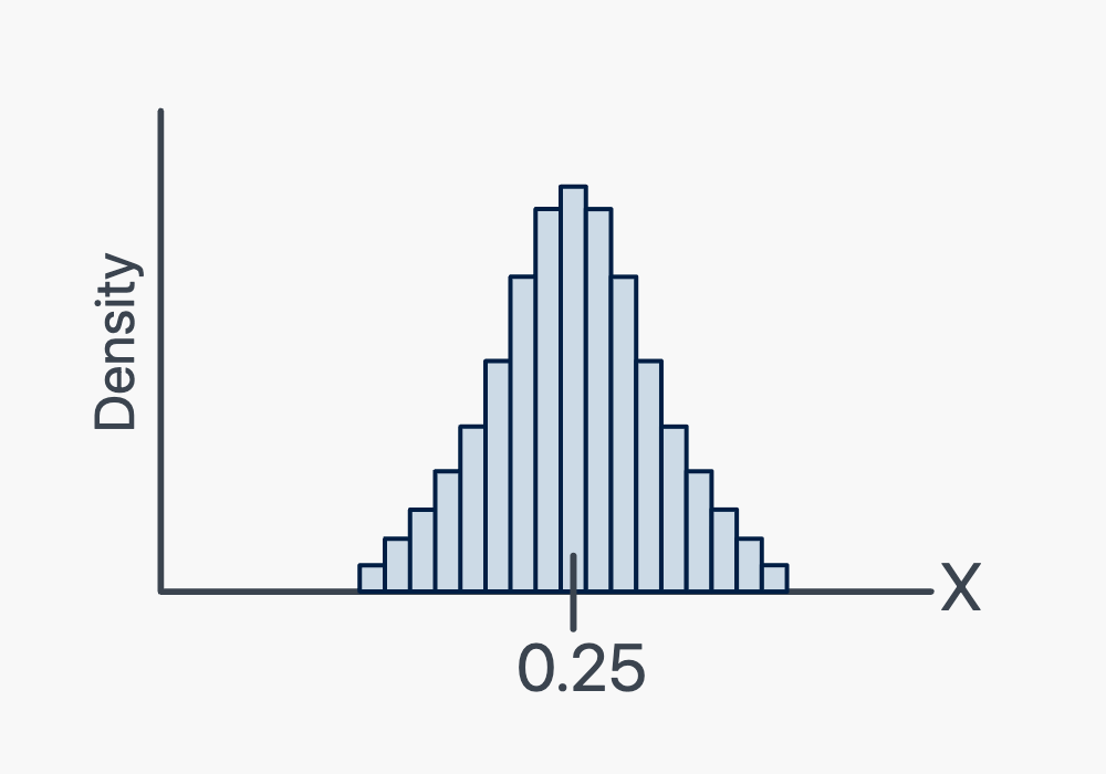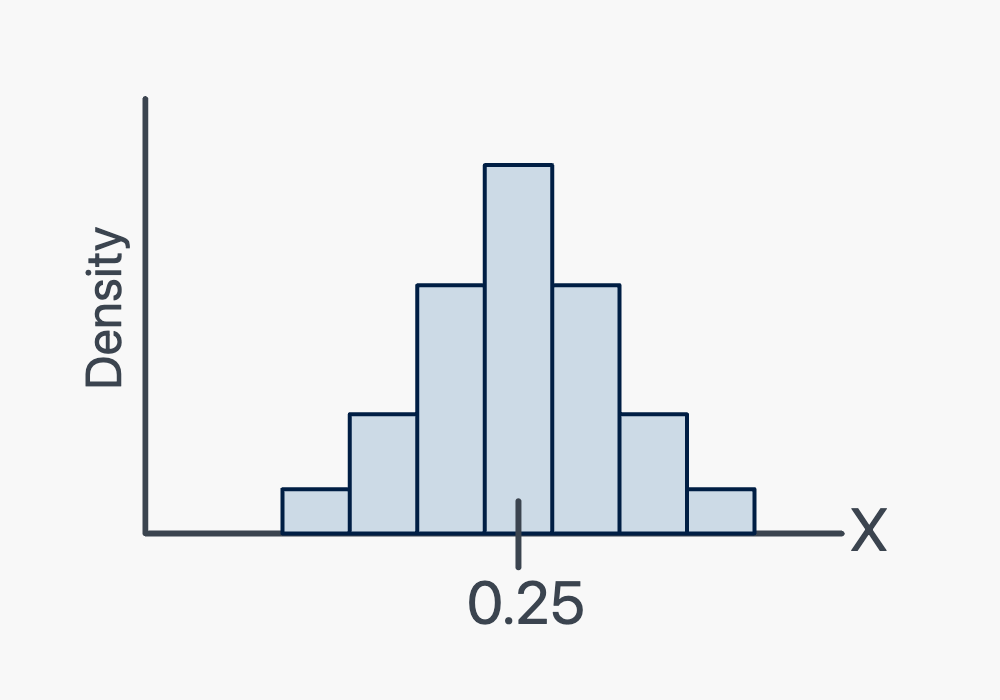 Now, you could imagine randomly selecting, let’s say, 100 hamburgers advertised to weigh a quarter-pound. If you weighed the 100 hamburgers, and created a density histogram of the resulting weights, perhaps the histogram might look something like this: