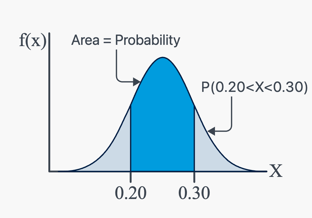 Now, you might recall that a density histogram is defined so that the area of each rectangle equals the relative frequency of the corresponding class, and the area of the entire histogram equals 1. That suggests then that finding the probability that a continuous random variable \(X\) falls in some interval of values involves finding the area under the curve \(f(x)\) sandwiched by the endpoints of the interval. In the case of this example, the probability that a randomly selected hamburger weighs between 0.20 and 0.30 pounds is then this area: