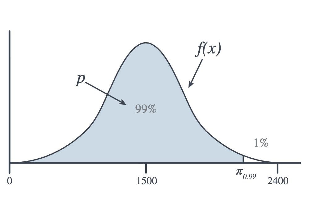 Example 14.7 A prospective college student is told that if her total score on the SAT Exam is in the 99th percentile, then she can most likely attend the college of her choice. It is well-known that the distribution of SAT Exam scores is bell-shaped, and the average total score is typically around 1500. Here is a picture depicting the situation: