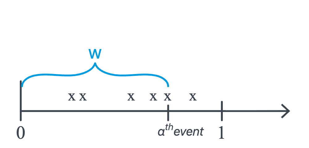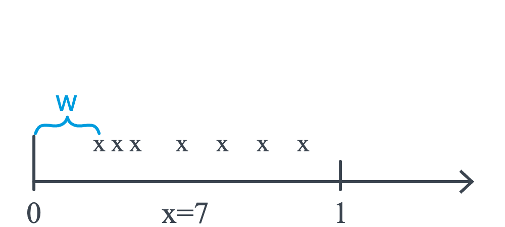 In this particular representation, seven (7) customers arrived in the unit interval. Previously, our focus would have been on the discrete random variable \(X\), the number of customers arriving. As the picture suggests, however, we could alternatively be interested in the continuous random variable \(W\), the waiting time until the first customer arrives. Let’s push this a bit further to see if we can find \(F(w)\), the cumulative distribution function of \(W\):