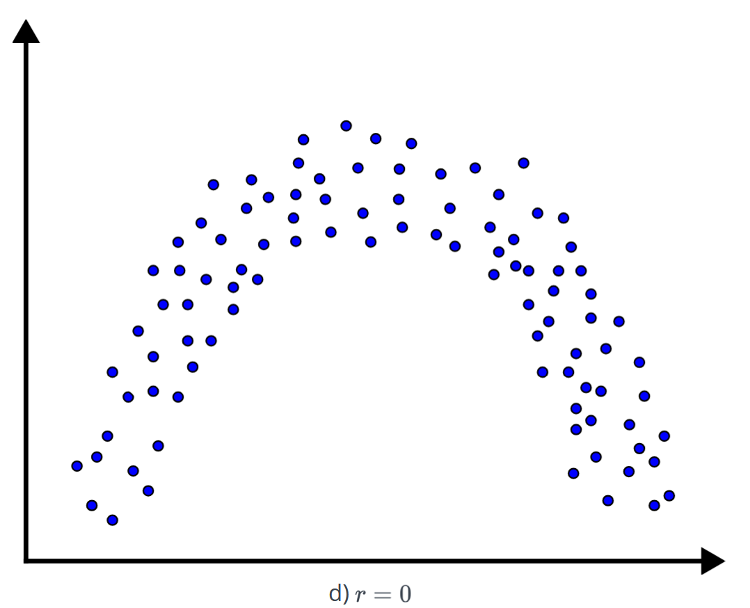 The following four graphs illustrate four possible situations for the values of r. Pay particular attention to graph (d) which shows a strong relationship between y and x but where r = 0. Note that no linear relationship does not imply no relationship exists!
